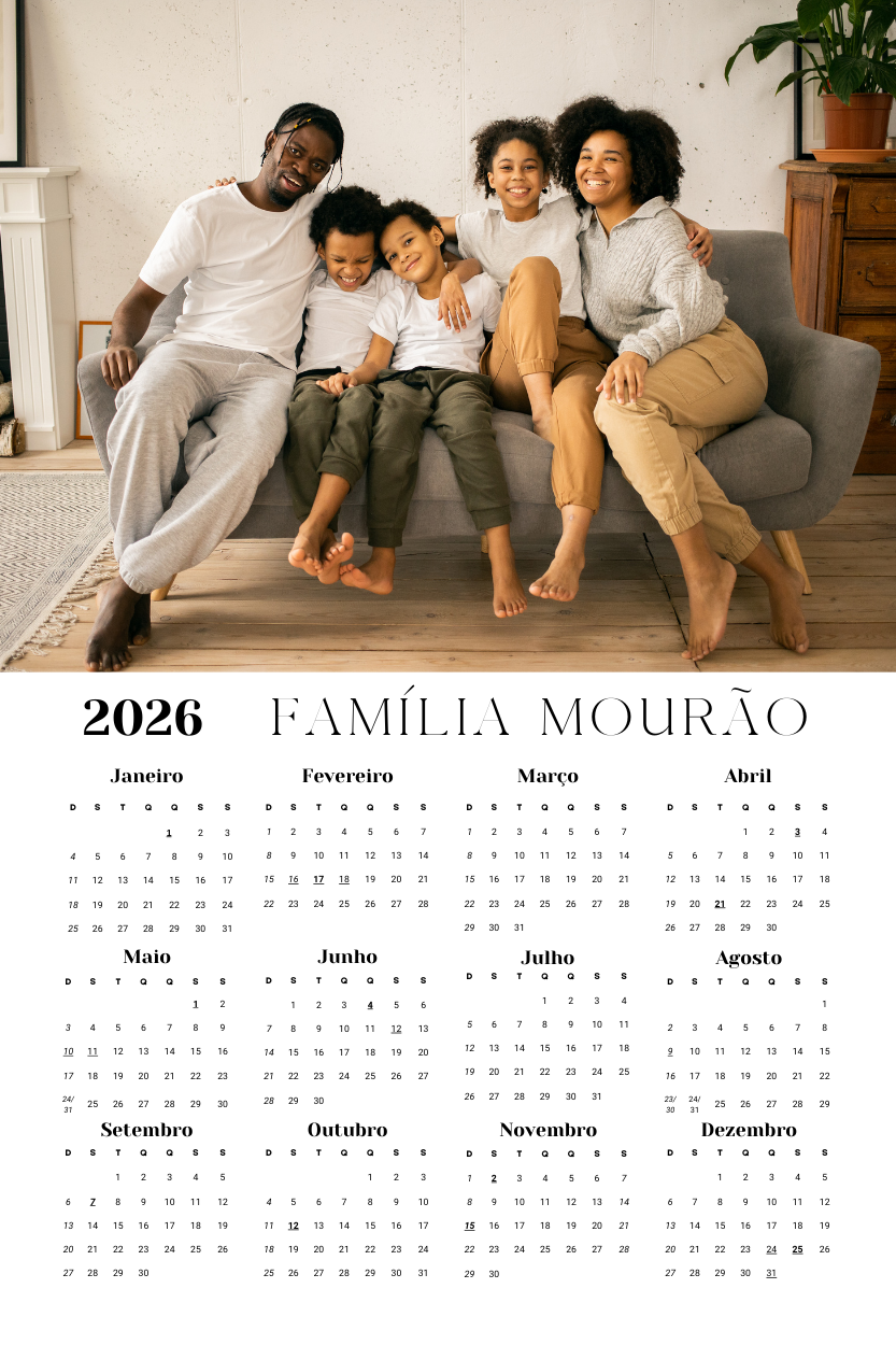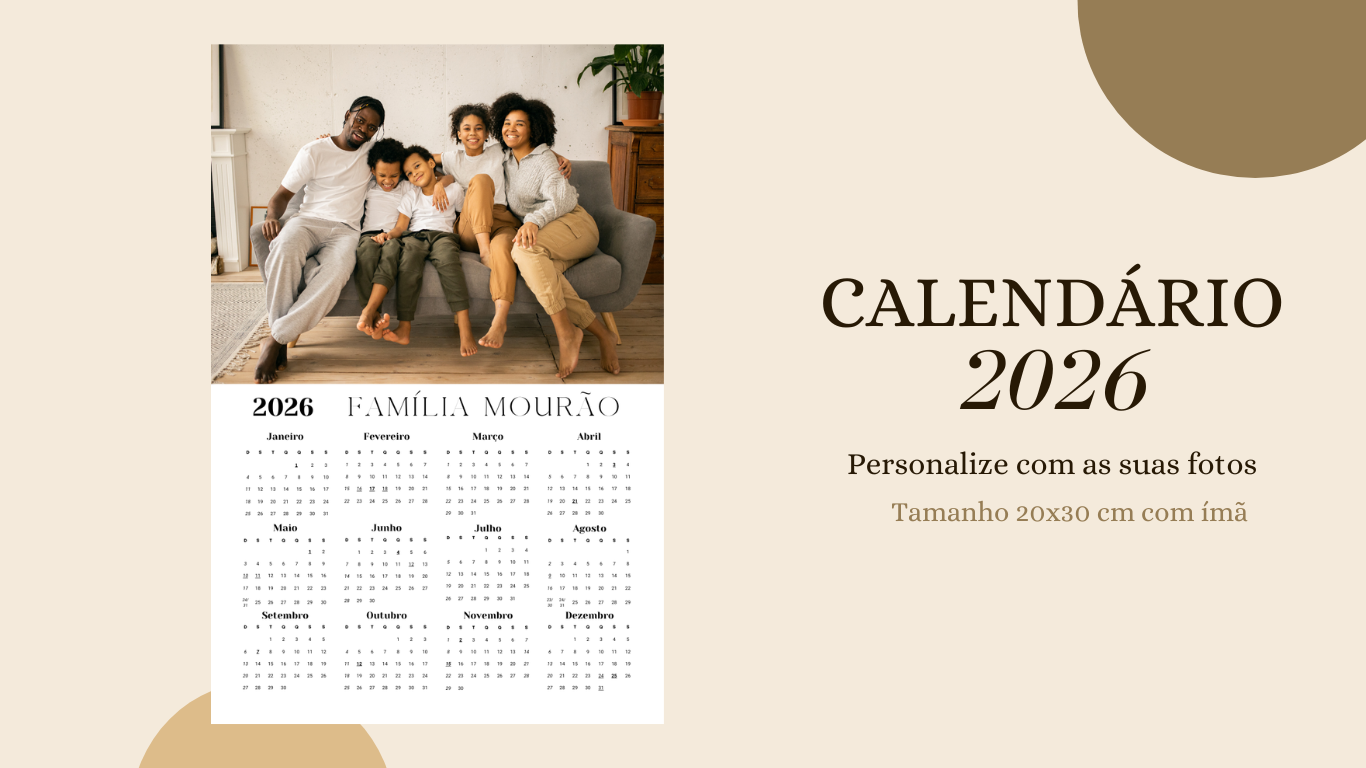 Faça seu calendário 2026 personalizado com foto. Calendário anual personalizável com foto e ímã no tamanho 20x30cm. R$ 39,50 Pedir Agora